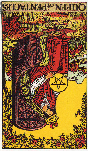 The Queen in the suit of Pentacles becomes aware of her Earthly attributes; she's reliable and sober, able to give good advice.