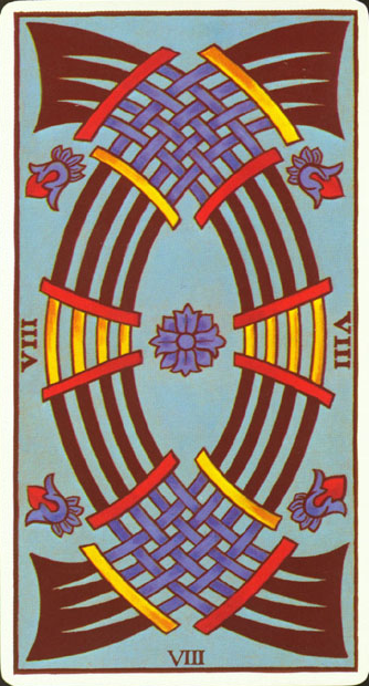 The 8 of Swords is about slowly regaining strength and energy. The 8 is an assignment number, and in the element of Swords it's a bit harder than usual.