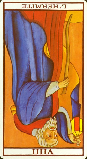 The Hermit shuts out the world and retreats into solitude to better understand some spiritual aspect of life. He opens to the cosmos and lets it's wisdom sink in. Hermits are often seen as wise old men who can guide a traveller along a journey.