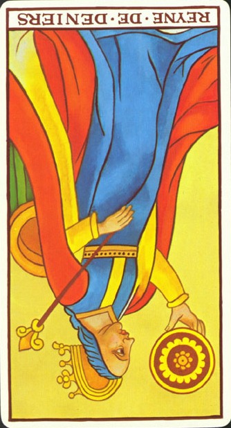 The Queen in the suit of Pentacles becomes aware of her Earthly attributes; she's reliable and sober, able to give good advice.