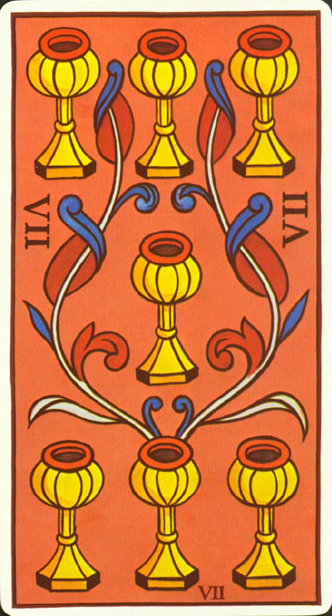 The 7 of Cups is about making a choice between different ideals. But Cups, with the water element, don't like making definitive choices that much, making this 7 in this suit a bit of a hard choice.