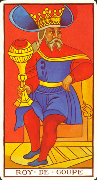 The King of Cups uses his intuition to achieve his ideals. Since Cups are turned inward, and Kings turned to the outside world, this card might be a difficult one, or it could be a powerful one.