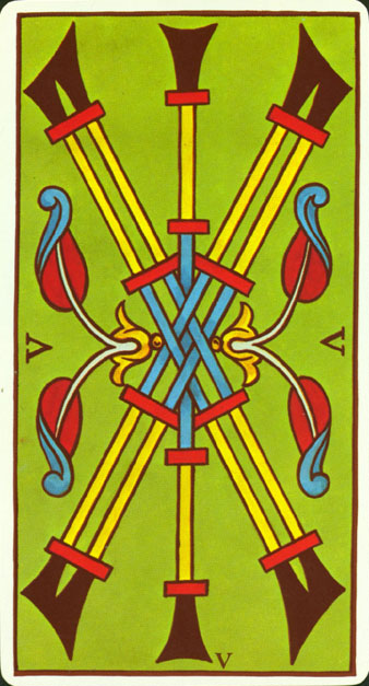 The 5 of Wands represents competition. The 5 is the second assignment number, and therefore a difficult card. 5 combined with the Wand's element fire challenges you. You'll have to fight hard for your idea, but you stand a good chance of succeeding.