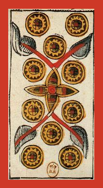 The 10 of Pentacles represents material posessions. The number 10 of Pentacles forms the links to the Ace (first card) of Wands (the first suit in the minor Arcana), and thus prepares to bring you back to the beginning of the minor Arcana, ready for a next cycle through the tarot.
