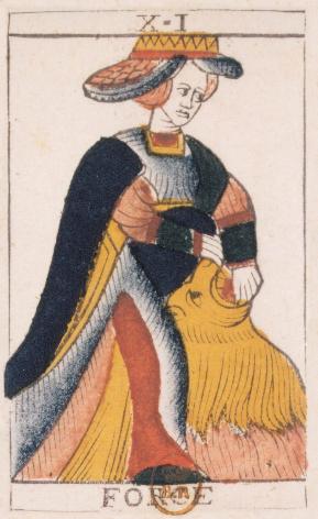 This card carries the number 11. In the Rider-Waite deck, Strength and Justice have swapped places because Waite saw links with the astrological signs Leo and Libra.