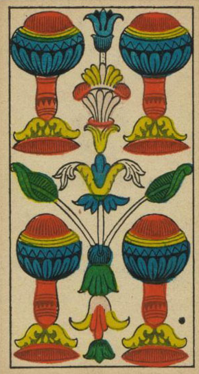 With the 4, the second cycle of this suit is commenced, where a choice between structure and feeling has to be made, where old securities have to be let go of to work towards a new future. But like Wands, Cups don't like structure much, they prefer to be free and dream rather than to make commitments and go for something.