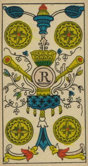 The 4 of Pentacles is about holding on to what you got. The number 4 represents structure and order, and fits well with the suit's element, Earth.