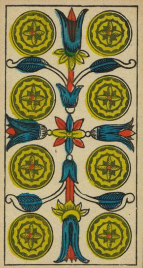 The 8 of Pentacles is about keeping up the hard work you're doing, and trying to be happy about doing that work at the same time. While the 3 of Pentacles is about completing a masterpiece, the 8 of Pentacles is about doing the apprentice work that makes you a master of your trade.