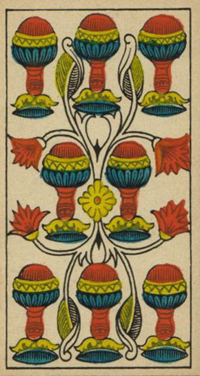 It's probably wise not to be too optimistic. If this card is next to a Swords card, it's time to be more careful and critical. If this card is next to a Coins card, it means you should be more practical and not get stuck in just thinking about your dreams and ideals.