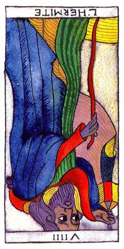The Hermit shuts out the world and retreats into solitude to better understand some spiritual aspect of life. He opens to the cosmos and lets it's wisdom sink in. Hermits are often seen as wise old men who can guide a traveller along a journey.