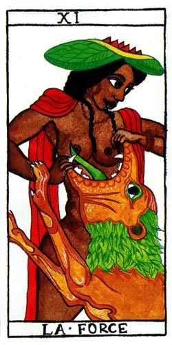 This card carries the number 11. In the Rider-Waite deck, Strength and Justice have swapped places because Waite saw links with the astrological signs Leo and Libra.