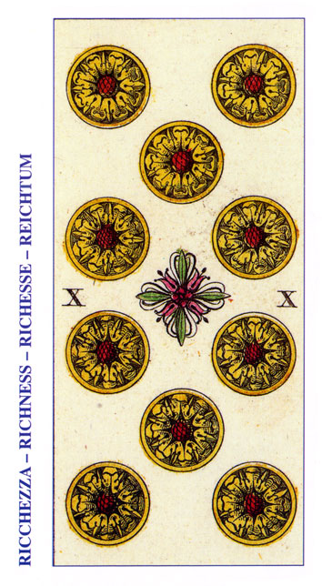The 10 of Pentacles represents material posessions. The number 10 of Pentacles forms the links to the Ace (first card) of Wands (the first suit in the minor Arcana), and thus prepares to bring you back to the beginning of the minor Arcana, ready for a next cycle through the tarot.