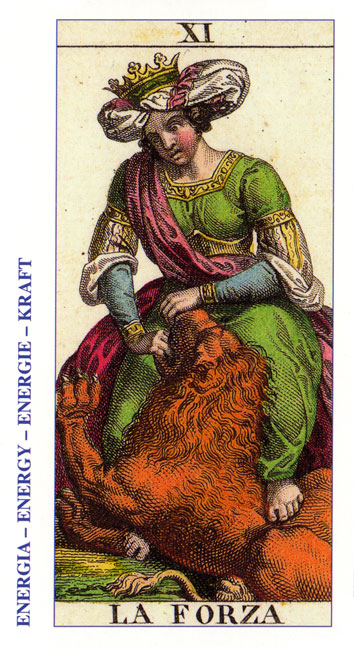 This card carries the number 11. In the Rider-Waite deck, Strength and Justice have swapped places because Waite saw links with the astrological signs Leo and Libra.