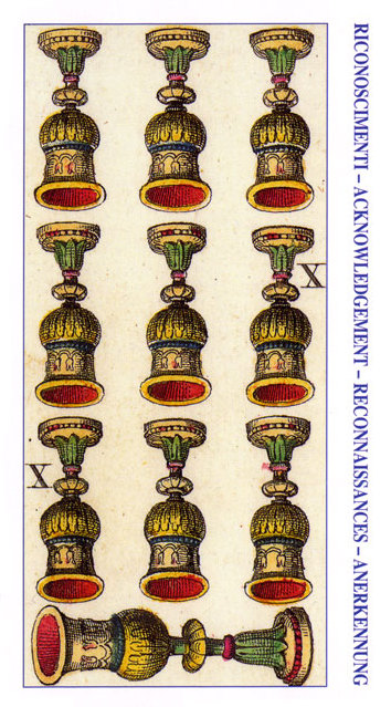 The 9 represents rest after work, which is another thing (like 8) that the element Fire associated with Wands is not very comfortable with. Fire likes to keep going. This rest will probably be spent thinking about what to do next along the course to completion.