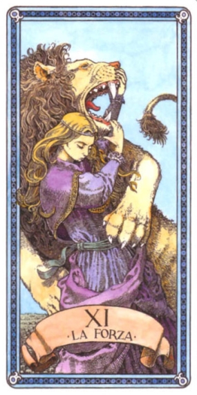 This card carries the number 11. In the Rider-Waite deck, Strength and Justice have swapped places because Waite saw links with the astrological signs Leo and Libra.