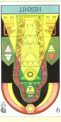 The Hermit shuts out the world and retreats into solitude to better understand some spiritual aspect of life. He opens to the cosmos and lets it's wisdom sink in. Hermits are often seen as wise old men who can guide a traveller along a journey.