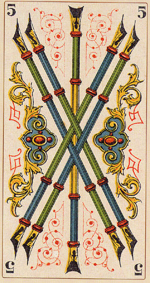 The 5 of Swords is about facing reality. The 5 is an assignment number, and in the slighly more difficult suit of Swords, it means you face a difficult challenge where your past experiences could hold you down.
