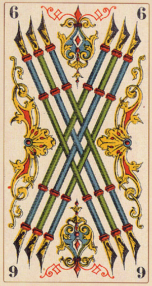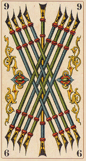 The 9 represents rest after work, which is another thing (like 8) that the element Fire associated with Wands is not very comfortable with. Fire likes to keep going. This rest will probably be spent thinking about what to do next along the course to completion.
