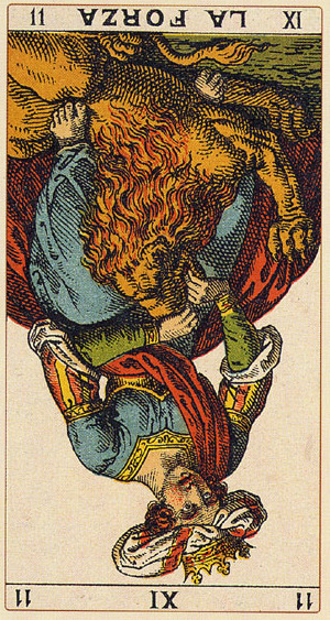 This card carries the number 11. In the Rider-Waite deck, Strength and Justice have swapped places because Waite saw links with the astrological signs Leo and Libra.