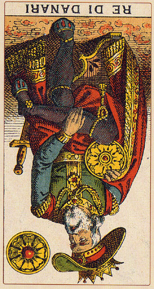 The King of Pentacles uses his Earthly attributes to rule. He goes about his work like an old style business man; he avoids unnecessary risks, aims for real results, and acts from confidence.
