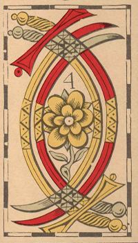 4 is the first number in the cycle of giving things shape. It's about making things real. The element of Swords also relates to making things real, so this enhances the effect so much that arrogance can cause you to exhaust yourself.