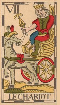 During the prevous card, The Lovers, all the wisdom of the first cards in the deck has been processed and a choice was made for personal growth. Now it's time to do something with all this baggage, to actually travel the road. A lot has been done so far, wisdoms have been accumulated and integrated into one's personality.