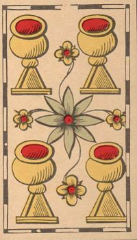 With the 4, the second cycle of this suit is commenced, where a choice between structure and feeling has to be made, where old securities have to be let go of to work towards a new future. But like Wands, Cups don't like structure much, they prefer to be free and dream rather than to make commitments and go for something.
