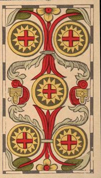 4 is the first number in the cycle of giving things shape. It's about making things real. The element of Swords also relates to making things real, so this enhances the effect so much that arrogance can cause you to exhaust yourself.