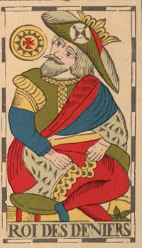 The King of Pentacles uses his Earthly attributes to rule. He goes about his work like an old style business man; he avoids unnecessary risks, aims for real results, and acts from confidence.