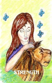 This card carries the number 11. In the Rider-Waite deck, Strength and Justice have swapped places because Waite saw links with the astrological signs Leo and Libra.