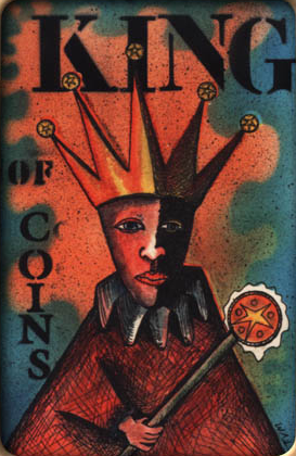 The King of Pentacles uses his Earthly attributes to rule. He goes about his work like an old style business man; he avoids unnecessary risks, aims for real results, and acts from confidence.
