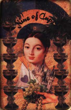 The 9 of Cups represents achievement and contentment. It is an excellent time to take some rest and enjoy yourself.