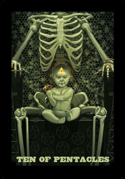 The 10 of Pentacles represents material posessions. The number 10 of Pentacles forms the links to the Ace (first card) of Wands (the first suit in the minor Arcana), and thus prepares to bring you back to the beginning of the minor Arcana, ready for a next cycle through the tarot.