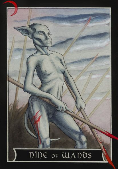The 9 represents rest after work, which is another thing (like 8) that the element Fire associated with Wands is not very comfortable with. Fire likes to keep going. This rest will probably be spent thinking about what to do next along the course to completion.
