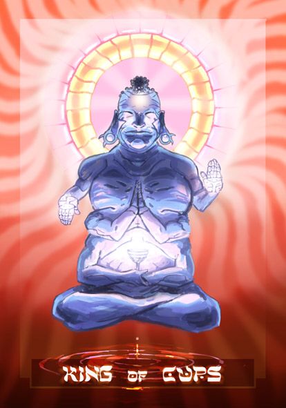 The King of Cups uses his intuition to achieve his ideals. Since Cups are turned inward, and Kings turned to the outside world, this card might be a difficult one, or it could be a powerful one.