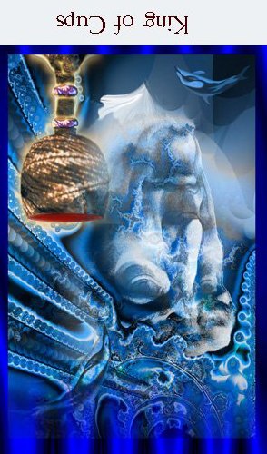 The King of Cups uses his intuition to achieve his ideals. Since Cups are turned inward, and Kings turned to the outside world, this card might be a difficult one, or it could be a powerful one.