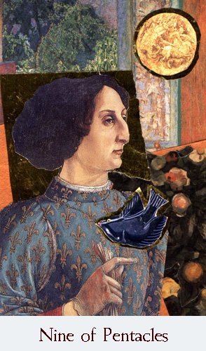 The 9 of Pentacles represents earned rest. The element Earth, attached to the Pentacles suit, appreciates the rest that completion of hard work brings. This is a good time for games and relaxation.
