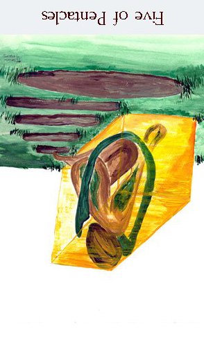 The 5 of Pentacles is an assignment-number card, and is about letting go of your securities. Pentacles element Earth (also) represents material posessions, so this card is about letting go of (some of) your worldly assets.