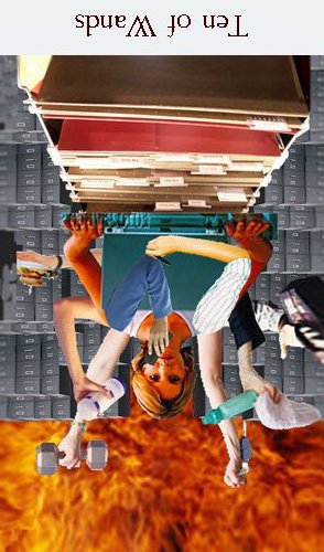 The 10 of Wands is therefore the transition from the element Fire (associated with Wands) to the element Water, associated with Cups. As you might imagine, this not the easiest of transitions.