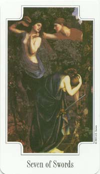 The 7 of Swords is about making slow progress because you can't trust the situation and/or people around you.