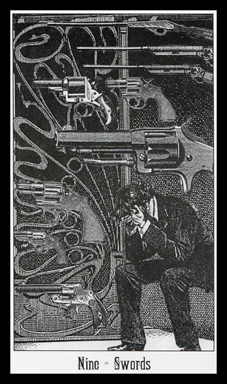 The 9 of Swords represents relief from cropped-up grief. The number 9 is a number of reward and rest and accomplishment. In the element of Swords there is not a lot of time for rest, but without any rest you'd just burn yourself out.