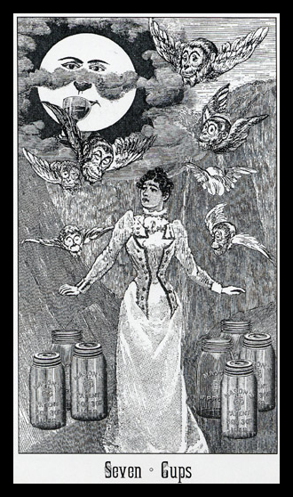 The 7 of Cups is about making a choice between different ideals. But Cups, with the water element, don't like making definitive choices that much, making this 7 in this suit a bit of a hard choice.