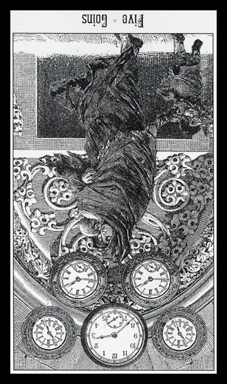 The 5 of Pentacles is an assignment-number card, and is about letting go of your securities. Pentacles element Earth (also) represents material posessions, so this card is about letting go of (some of) your worldly assets.