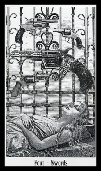 4 is the first number in the cycle of giving things shape. It's about making things real. The element of Swords also relates to making things real, so this enhances the effect so much that arrogance can cause you to exhaust yourself.