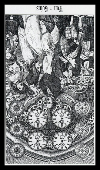 The 10 of Pentacles represents material posessions. The number 10 of Pentacles forms the links to the Ace (first card) of Wands (the first suit in the minor Arcana), and thus prepares to bring you back to the beginning of the minor Arcana, ready for a next cycle through the tarot.