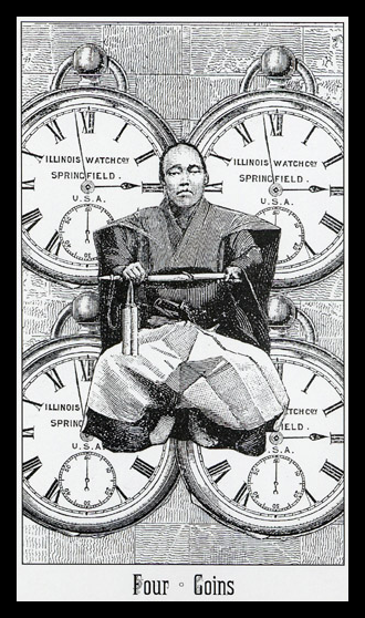 The 4 of Pentacles is about holding on to what you got. The number 4 represents structure and order, and fits well with the suit's element, Earth.
