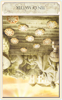 The 10 of Pentacles represents material posessions. The number 10 of Pentacles forms the links to the Ace (first card) of Wands (the first suit in the minor Arcana), and thus prepares to bring you back to the beginning of the minor Arcana, ready for a next cycle through the tarot.