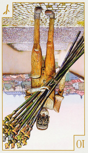 The 10 of Wands is therefore the transition from the element Fire (associated with Wands) to the element Water, associated with Cups. As you might imagine, this not the easiest of transitions.