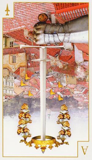 The number 1, associated with this Ace card, is the number of a fresh start with yet more new impulses coming your way. It might be compared to The Fool, the first card of the major arcana.