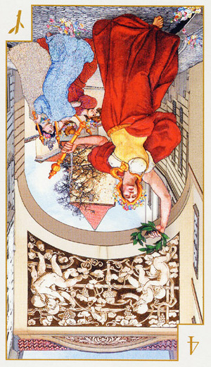 With the 4, the second cycle of this suit is commenced, where a choice between structure and feeling has to be made, where old securities have to be let go of to work towards a new future. But like Wands, Cups don't like structure much, they prefer to be free and dream rather than to make commitments and go for something.